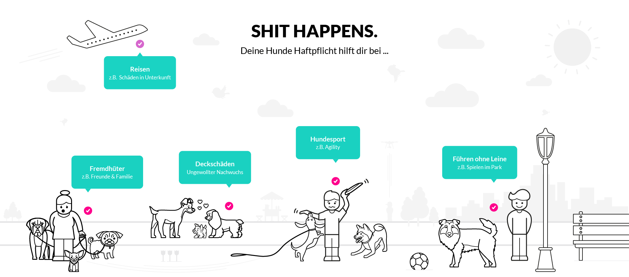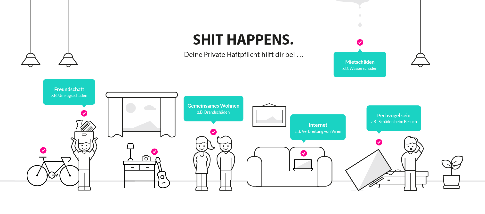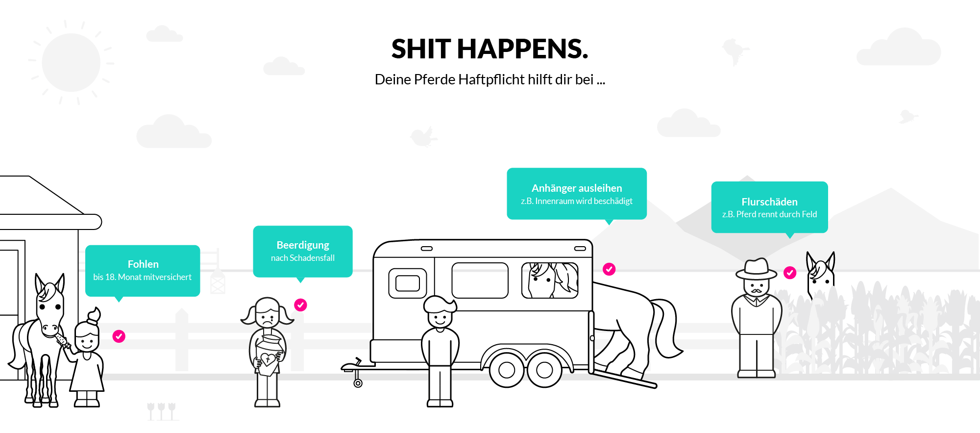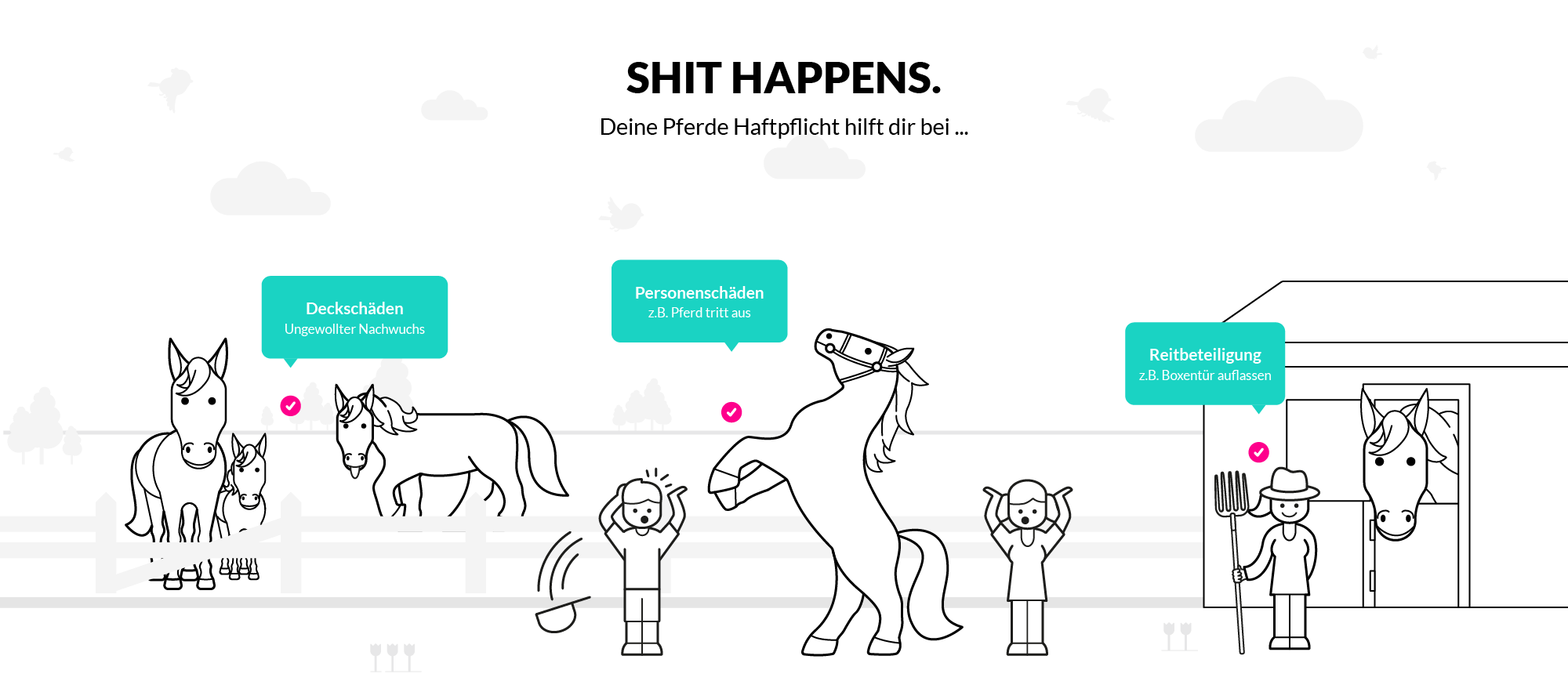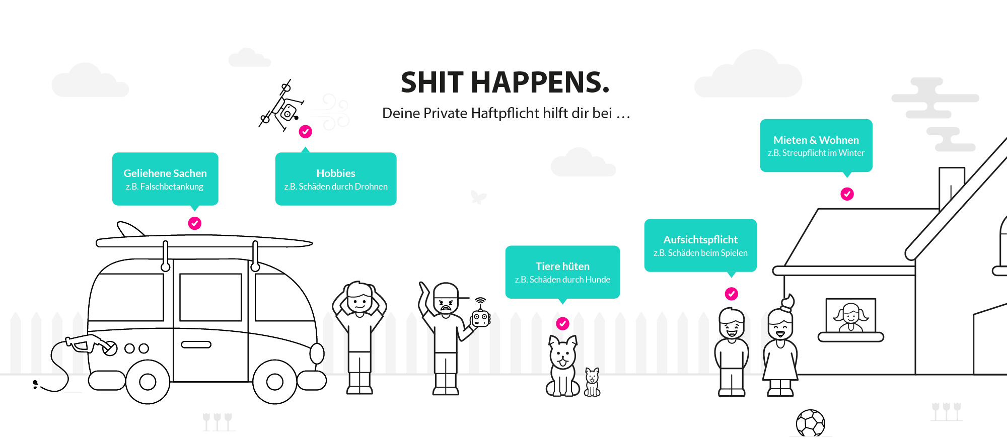 Unser erstes Produkt, der Private Haftpflichtschutz, ist ein Muss und lässt sich einfach online oder über unsere App abschließen. In nur 3 Minuten und für 72 Euro im Jahr erhältst du umfassenden Schutz mit allen Leistungen inklusive. Dank unserer Versicherungs-Flatrate, ähnlich wie bei Netflix & Co., sind Tarifanpassungen überflüssig. Ob Single, Familie, Berufseinsteiger, digitaler Nomade, Extremsportler oder Drohnen-Hobbypilot – wir haben für jeden das passende Produkt. Unsere Hunde- und Pferde-Haftpflichtversicherung ergänzen seit 2017 unser Angebot.