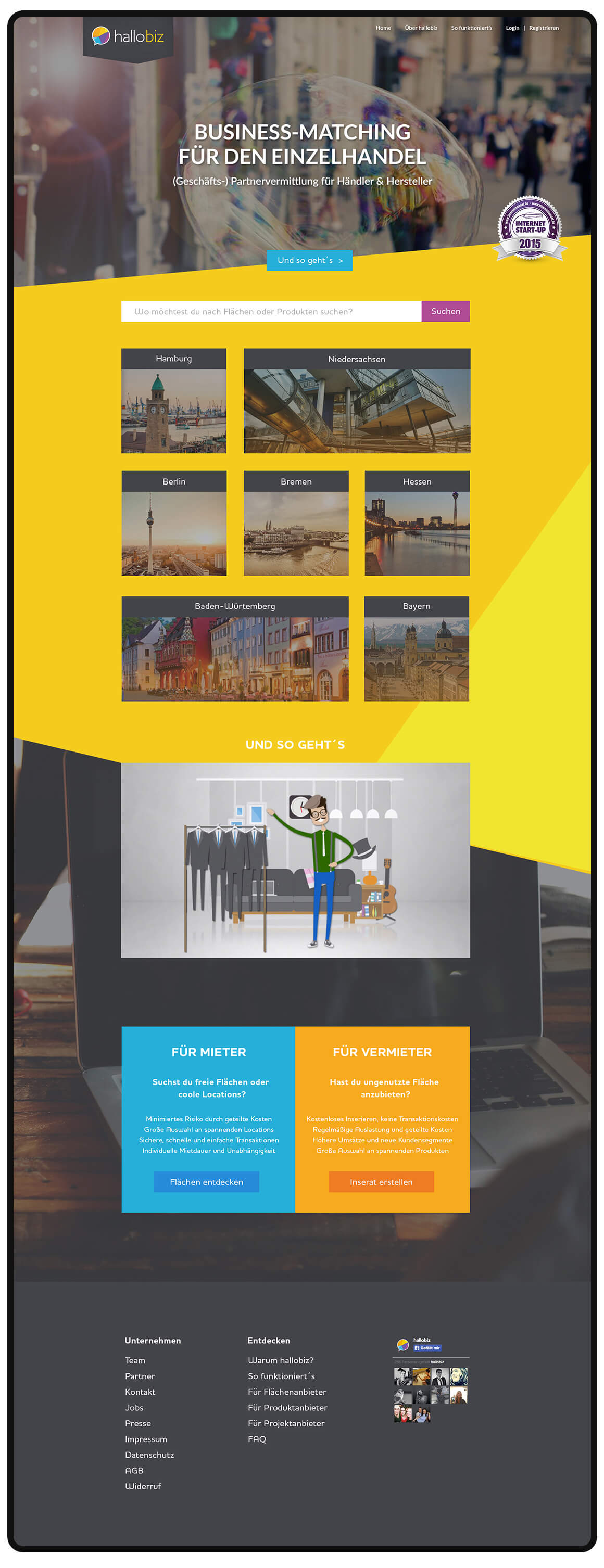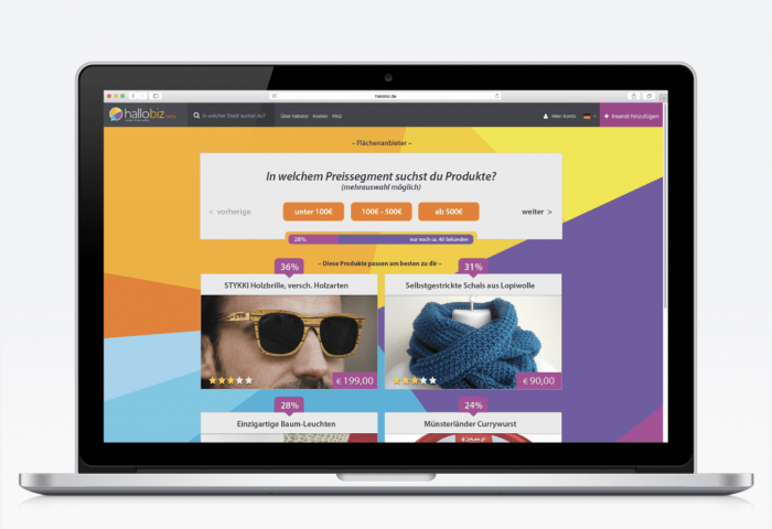 hallobiz ist ein Onlinemarktplatz für Business Sharing und bietet die Möglichkeit, ungenutzte Verkaufs- oder Serviceflächen für einen begrenzten Zeitraum zu teilen. Ob ein Verkaufsstand auf dem Wochenmarkt, eine Kleiderstange in einer Boutique, ein PopUp Store im Szeneviertel oder eine Eventfläche im leerstehenden Farbrikgebäude – alles ist möglich! Anfallende Kosten, werden für die gemeinsame Mietdauer geteilt und Flächen- als auch Produktanbieter auf diese Weise entlastet.
