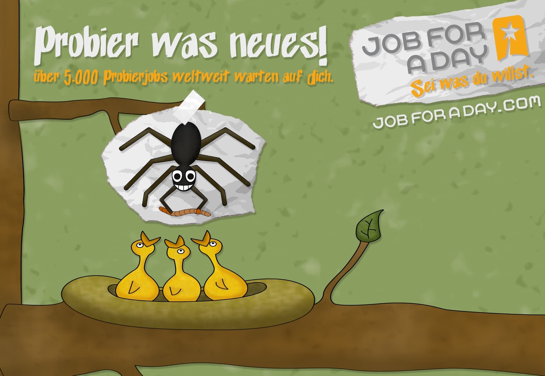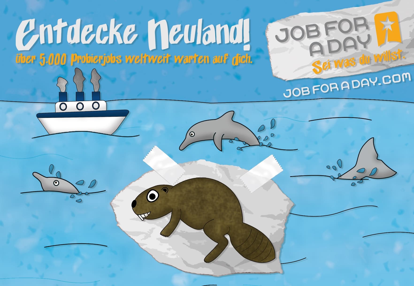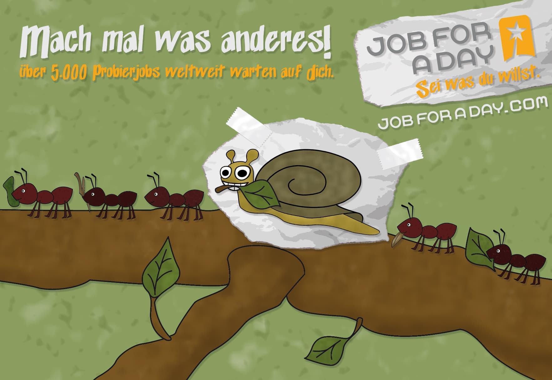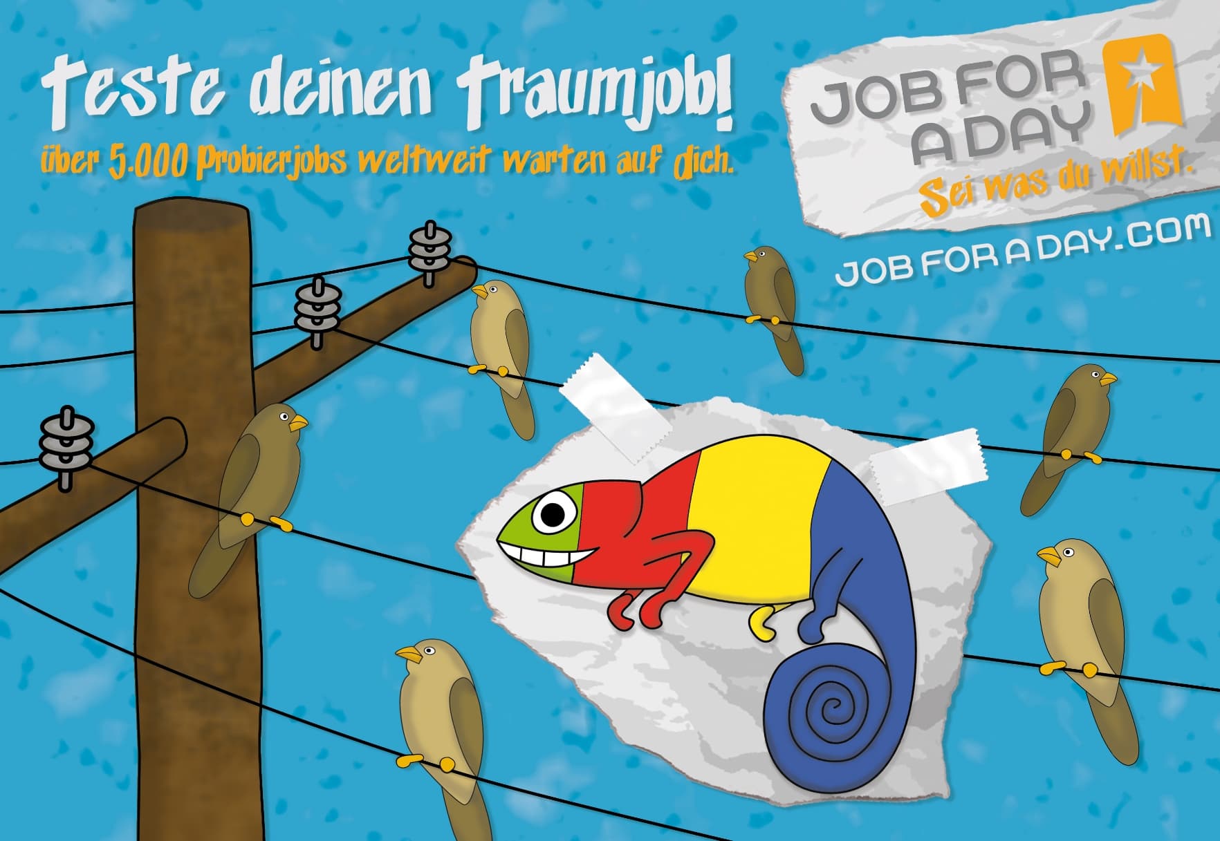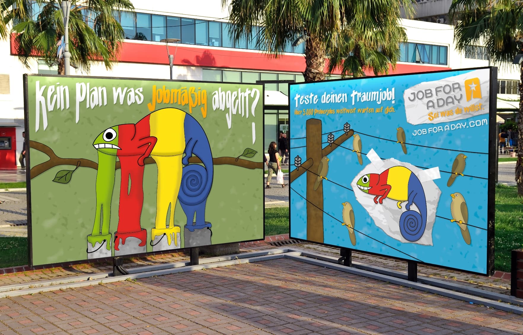 Die Vision von „Job for a day“ ist es, Menschen aus ihrem Alltag zu reißen und ihnen einen Tag lang die Möglichkeit zu geben, das zu erleben, was sie wirklich interessiert. Genau das sollen die hier illustrierten Plakate transportieren. Egal, ob du am Anfang deiner beruflichen Laufbahn stehst und Orientierung suchst oder ob du bereits im Job bist und nach neuen Herausforderungen suchst – unser Konzept ist für alle gemacht, einschließlich der Abenteuerlustigen, die, die gerne Neues ausprobieren und für die, die sich gerne neuen Herausforderungen stellen.