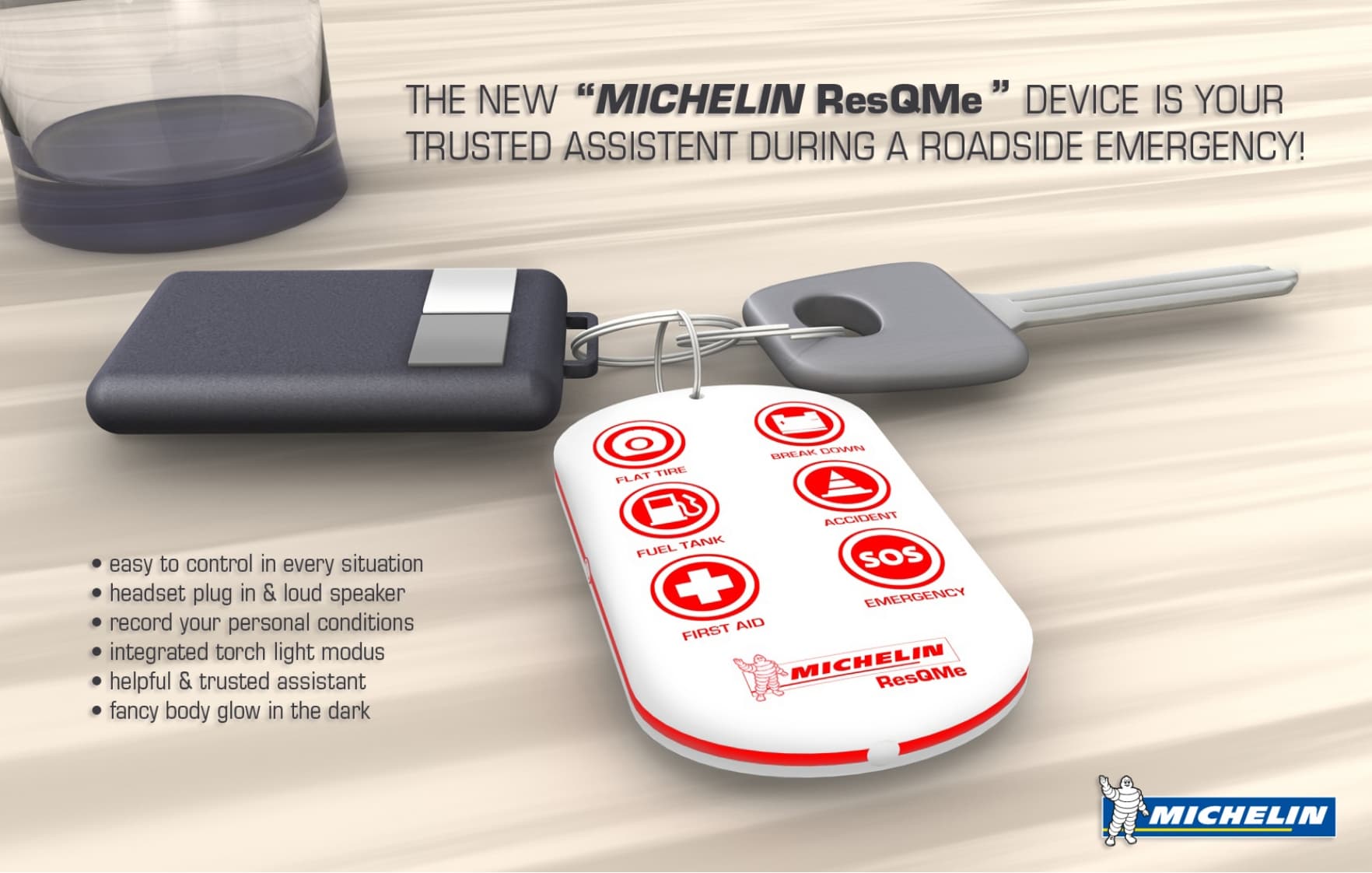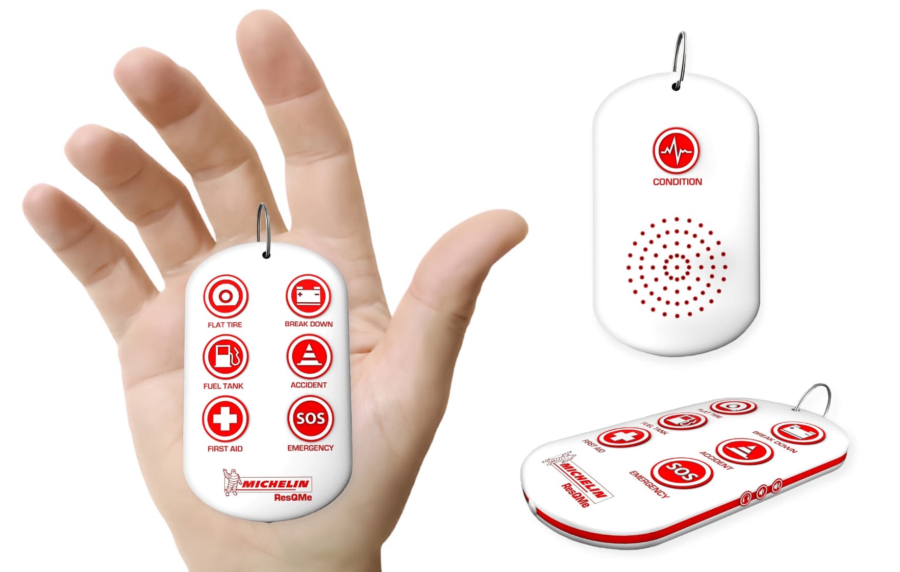 Das Michelin ResQme ist ein kompaktes Notfall-Gadget, das dauerhaft am Autoschlüssel befestigt wird, so dass es immer in Reichweite des Fahrers ist, auch nach einem Unfall. Mit verschiedenen Notfallfunktionen kann es den Fahrer in solchen Situationen sofort mit einem 24/7 Hilfe-Service über einen integrierten Lautsprecher verbinden, um Unterstützung zu bieten, bis Hilfe vor Ort eintrifft. Die Hauptzielgruppen für dieses Gerät sind ältere Menschen, Menschen mit körperlichen Einschränkungen und Familien mit Kindern, die in Notsituationen auf besonders schnelle und direkte Hilfe angewiesen sind.