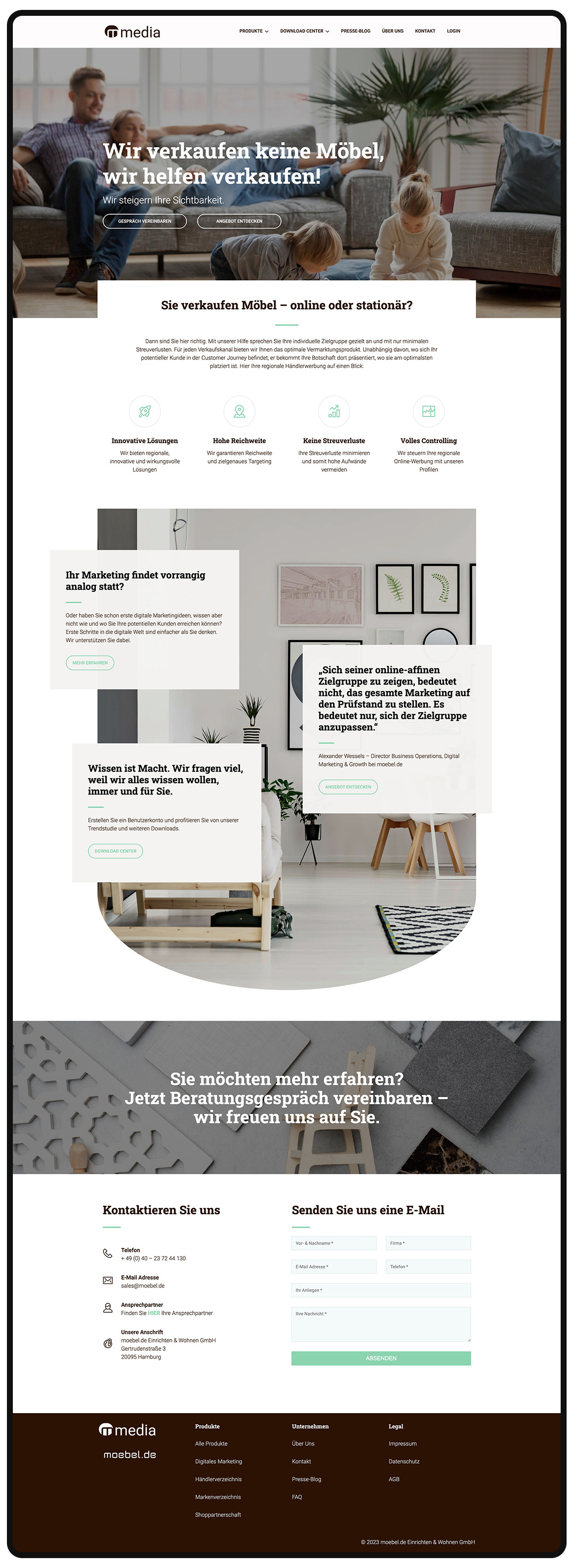Die neue B2B-Website moebel.media sollte das Design von moebel.de aufgreifen, jedoch mit neuen CI-Farben und einem anderen Logo. Ich habe dem Kunden mein Webseiten-Konzept vorgestellt, das neue Konzept technisch umgesetzt, die bereitgestellten Texte überarbeitet und die von mir festgelegte Corporate Imagery integriert. Darüber hinaus enthält die Website einen passwortgeschützten Kundenbereich, über den exklusive Studien und Dokumente heruntergeladen werden können. Schließlich habe ich das Webprojekt in drei Schulungen an das Team von moebel.de übergeben.