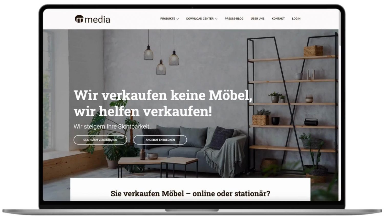 Die neue B2B-Website moebel.media sollte das Design von moebel.de aufgreifen, jedoch mit neuen CI-Farben und einem anderen Logo. Ich habe dem Kunden mein Webseiten-Konzept vorgestellt, das neue Konzept technisch umgesetzt, die bereitgestellten Texte überarbeitet und die von mir festgelegte Corporate Imagery integriert. Darüber hinaus enthält die Website einen passwortgeschützten Kundenbereich, über den exklusive Studien und Dokumente heruntergeladen werden können. Schließlich habe ich das Webprojekt in drei Schulungen an das Team von moebel.de übergeben.